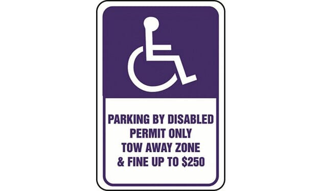 Symbol of Accessibility with "Parking By Disabled Permit Only - Tow Away Zone & Fine Up To $250" Text