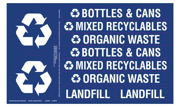 - Includes four labels: BOTTLES & CANS, MIXED RECYCLABLES, ORGANIC WASTE, LANDFILL