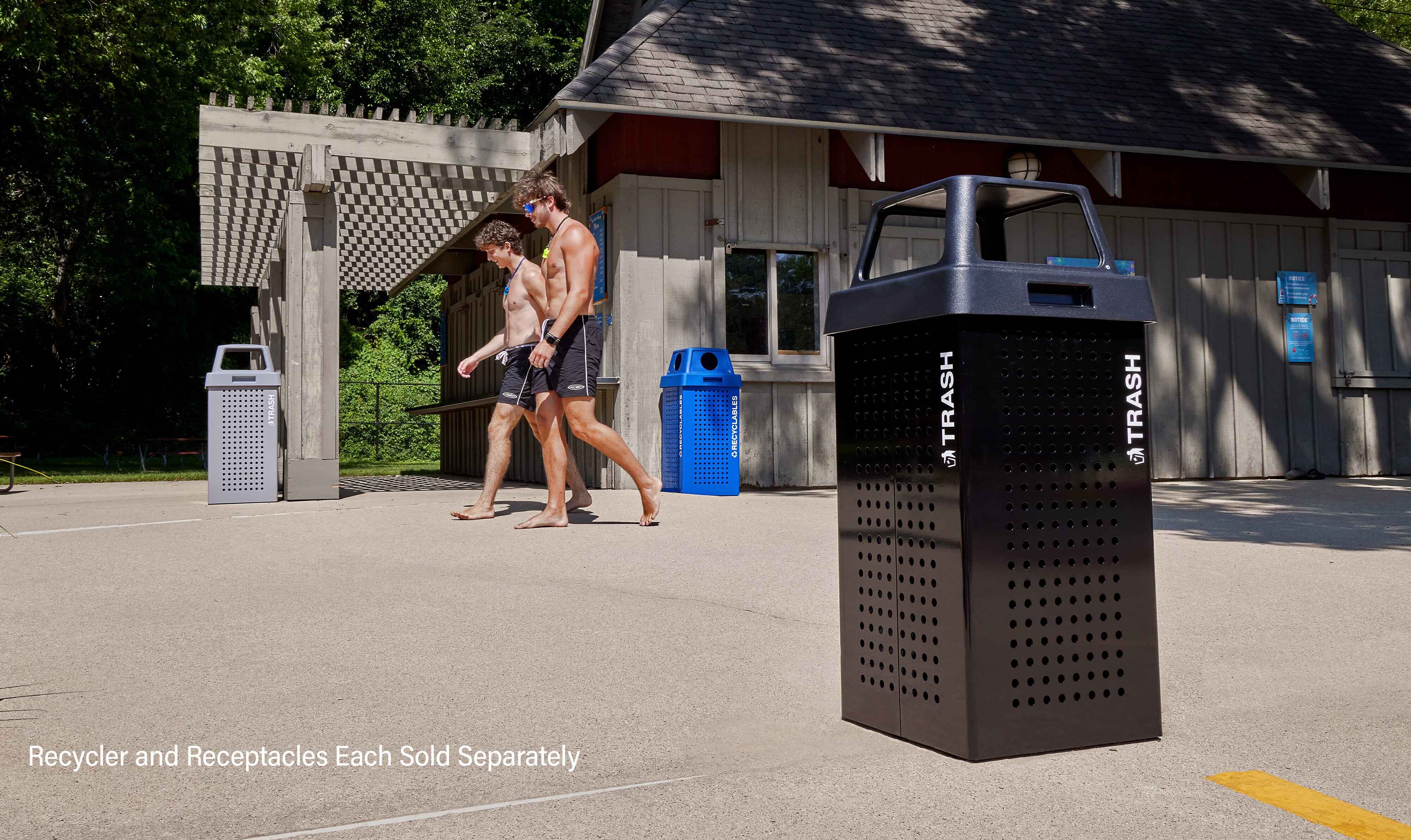- Four heavy-duty, white vinyl TRASH decals pre-applied on all four sides of receptacle