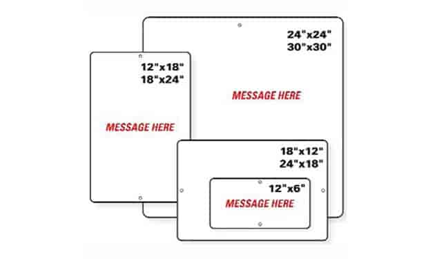 | Model Name | 12'' x 6'' Reflective Aluminum Sign | 18'' x 12'' Reflective Aluminum Sign | 24'' x 18'' Reflective Aluminum Sign | 24'' x 24'' Reflective Aluminum Sign | 30'' x 30'' Reflective Aluminum Sign | 12'' x 18'' Reflective Aluminum Sign | 18'' x 24'' Reflective Aluminum Sign |