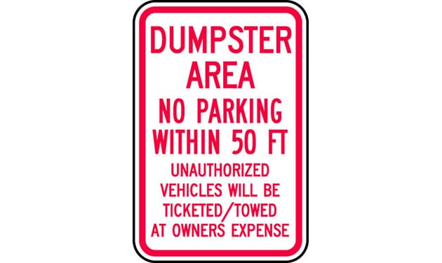 "Dumpster Area - No Parking Within 50 FT - Unauthorized Vehicles Will Be Ticketed/Towed At Owner's Expense"