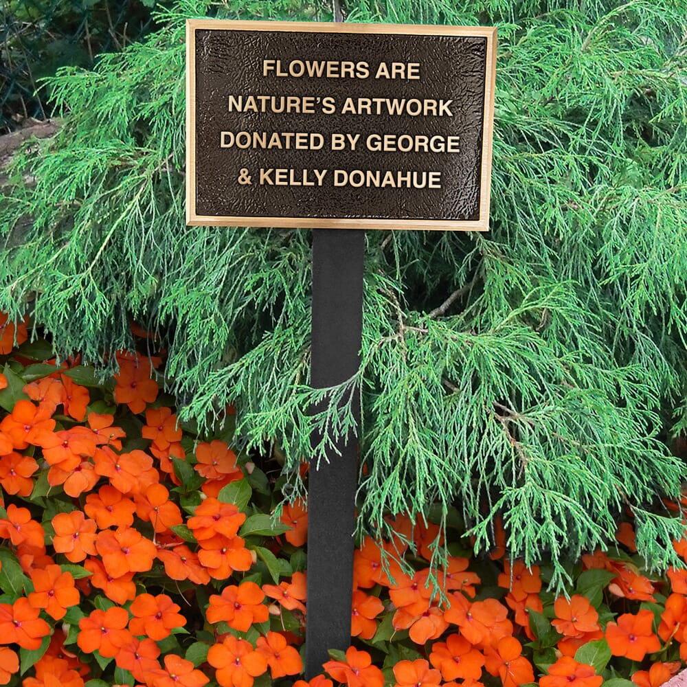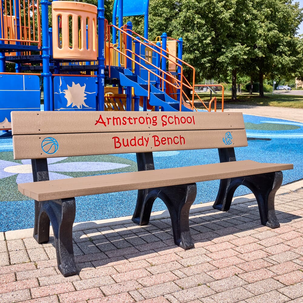 Recycled-plastic or metal benches with personalized inlays or cut lettering.