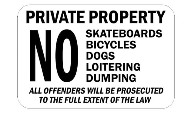 "Private Property - No Skateboards, Bicycles, Dogs, Loitering, Dumping All Offenders Will Be Prosecuted To The Full Extent Of The Law"