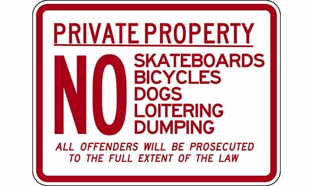 "Private Property No Skateboards Bicycles Dogs Loitering Dumping All Offenders Will Be Prosecuted To The Fullest Of The Law" Sign