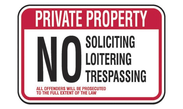 "Private Property - No Soliciting, Loitering, Trespassing"