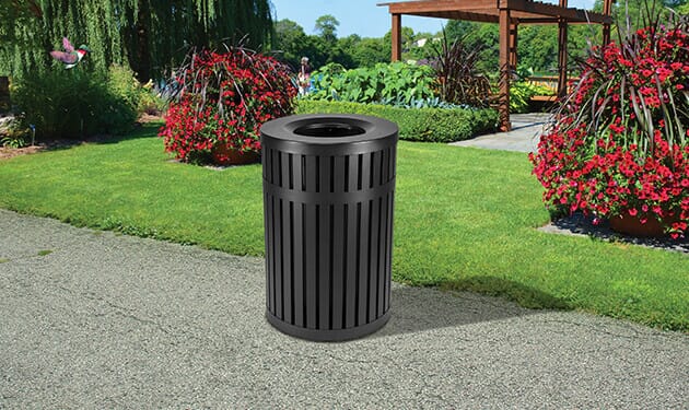 - 45-gallon receptacle made of heavy-gauge fire-safe, steel slats