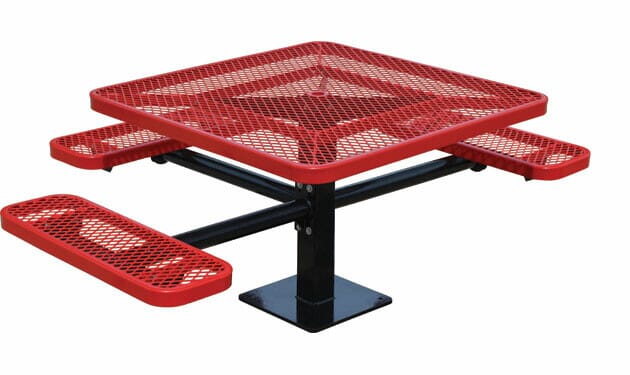 - Table and bench tops feature diamond-shaped expanded metal with smooth, rounded corners for safety