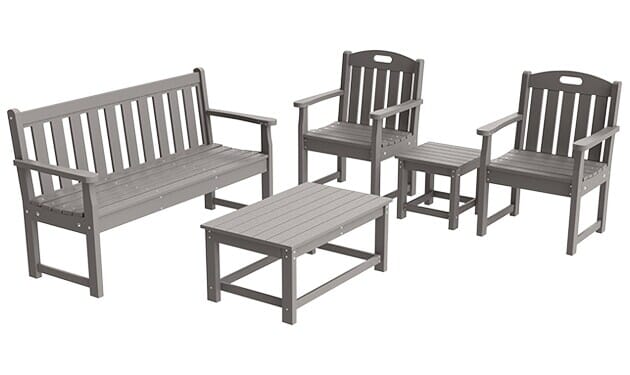 - Set includes 1 bench, 2 armchairs, 1 coffee table and 1 side table