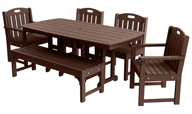 - Set includes 6 ft. rectangular table, 2 side chairs, 2 armchairs and 1 backless bench