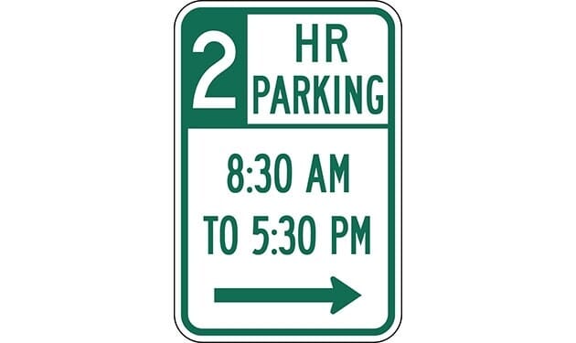 Two Hour Parking with Times 8:30 A.M. to 5:30 P.M. and Right Arrow Sign