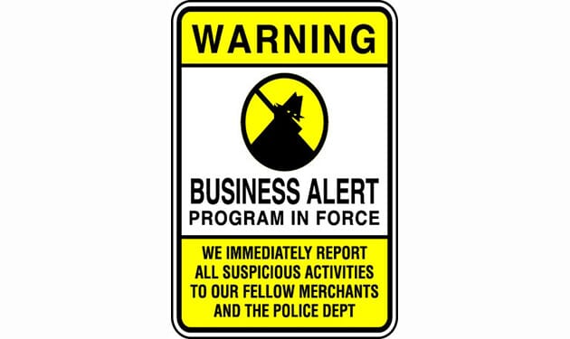 "Warning - Business Alert Program In Force - We Immediately Report All Suspicious Activities To Our Fellow Merchants And The Police Dept"